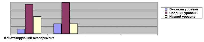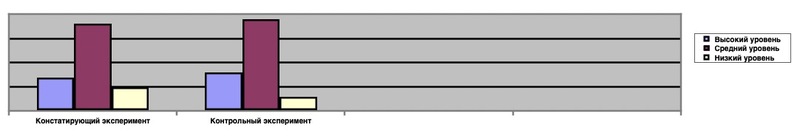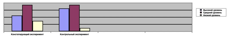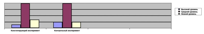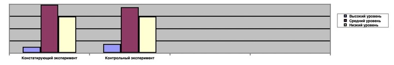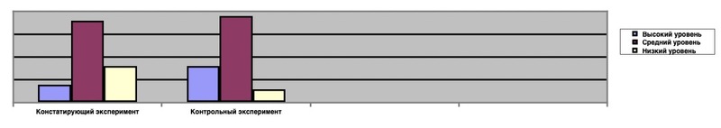 Проанализировав полученные данные, прихожу выводу о том, что результаты контрольной группы по каждому компоненту изменились незначительно. Количество учащихся овладевших высоким уровнем сформированности когнитивного компонента выросло лишь на 6, 7 %, в то время как результаты экспериментальной группы улучшились на 13, 4 %. Количество учащихся, обладающих средним уровнем сформированности когнитивного компонента в контрольной группе не изменилось, в экспериментальной группе этот уровень увеличился на 3, 3 %. Отмечаются значительные изменения в результатах экспериментальной группы, так, число учащихся, обладающих низким уровнем сформированности когнитивного компонента сократилось на 16, 7 %. Сравнительные данные отражены в следующих диаграммах: