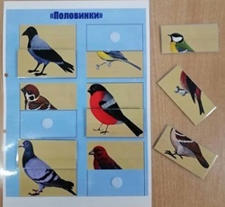 - Дидактическая игра: Авторское лото «Птицы нашего края» (Рис. 1). Дети получают карточки с контурными изображениями птиц и закрывают их цветными картинками, которые ведущий достает из мешочка, называя птицу и кратко о ней рассказывая.