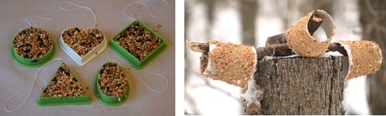 - Вариант 1: «Птичий пирог». Из картонной основы, зерен, семечек и желатина создается съедобная подвесная кормушка.
