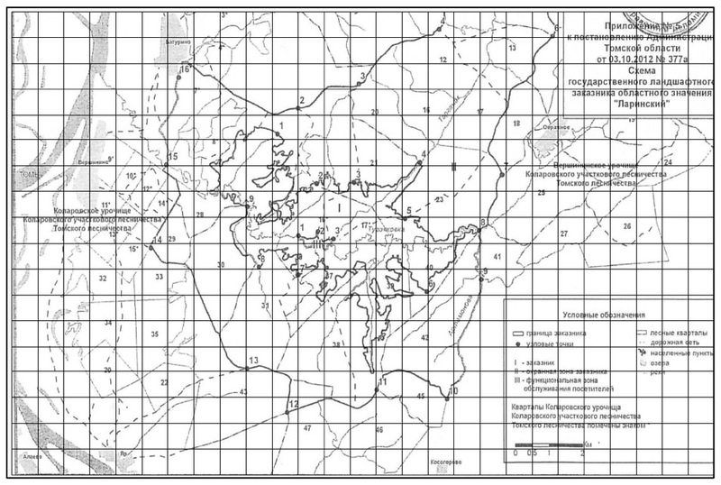 «Губернатор и Департамент природных ресурсов и охраны окружающей среды Томской области в 1993 году подписали распоряжение о создании государственного ландшафтного заказника областного значения, как особо охраняемой природной территории в Томской области". Он расположен на юге Томского района, в 30 км, от г. Томска в среднем течении р. Тугояковки (правый приток р. Томи), в окрестностях нежилой д. Ларино (в 6 км к востоку от с. Вершинино), от которой и произошло название заказника. Он занимает площадь 1,5 тыс. га. В пределах заказника расположено несколько памятников природы – Звездный ключ и Капитоновский родник, а также редкое на территории области поселение алтайского сурка, произрастают 427 видов редких растений, в том числе 26 видов, подлежащих охране. Тут же обитают млекопитающие: бобр, серый сурок, сибирская косуля, барсук, летяга, рысь, волк, лиса, и птицы: тетеревидные, водоплавающие, крупные хищные.