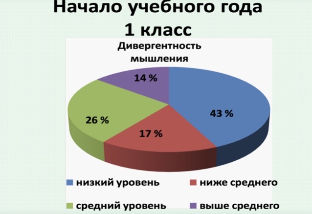 Результаты показали, что у 43% учеников уровень креативности был низким, а у 17% – ниже среднего. Эти данные были учтены при планировании работы школьного психолога, поскольку творческие способности можно и нужно развивать.