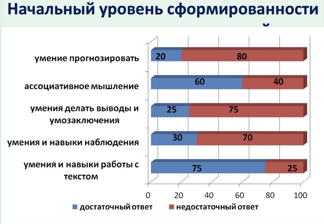 Диагностика показала, что у детей лучше сформированы навыки работы с текстом, чем навыки наблюдения. Умения делать выводы и умозаключения находятся на стадии формирования.