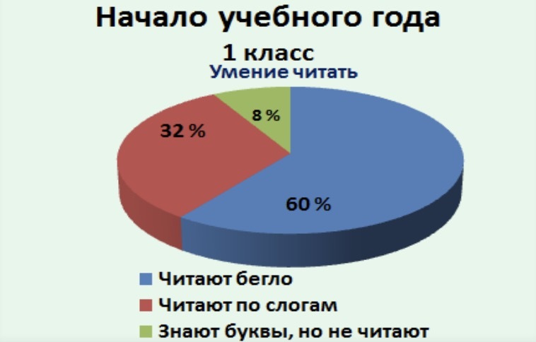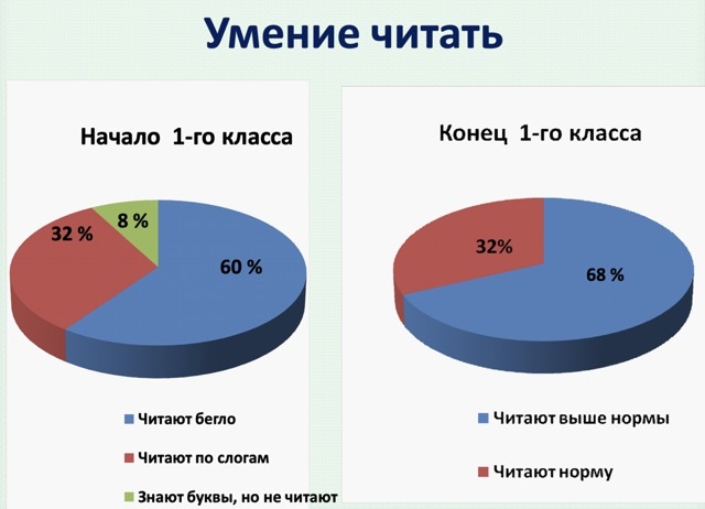 К концу первого класса у детей сформировались определенные читательские навыки, и процент учеников с низким уровнем успеваемости перешёл к среднему. Все дети читали в пределах нормы или выше. Важную роль в этом сыграли школьная библиотека и библиотека микрорайона, где проводились библиотечные часы.
