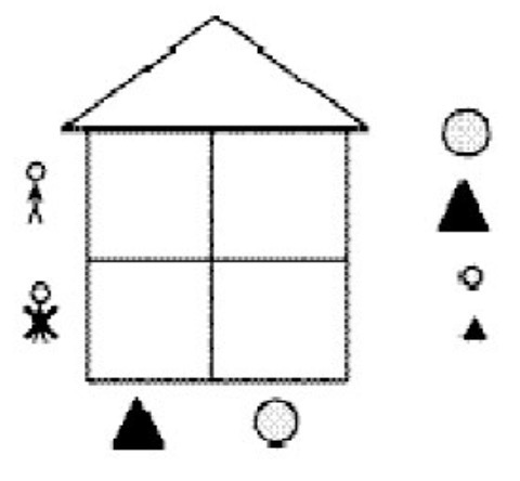 2. Задание на внимание, знание геометрических фигур, классификации по трем признакам: цвет, форма, величина (рис. 2): нужно расселить жильцов в домики, используя знаки-подсказки (задание у доски выполняет один ребёнок, остальные дети за столами выполняют работу самостоятельно с блоками Дьенеша).