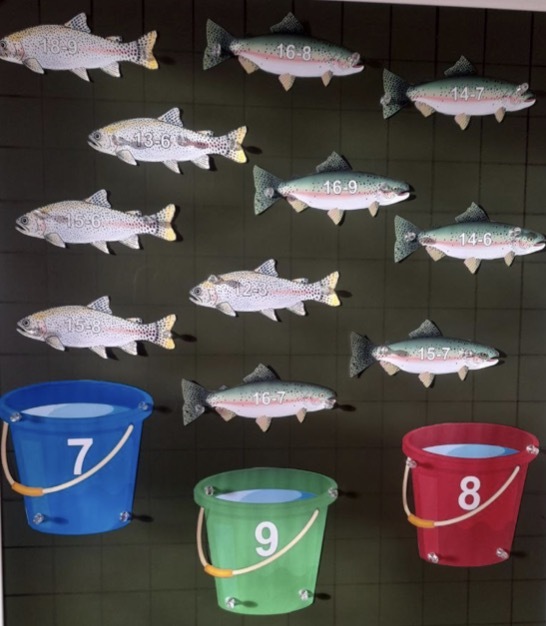 На доске прикреплены три ведерка с цифрами 7,8,9 и рыбки с примерами: