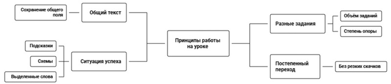 В основе моей работы лежат несколько принципов. Во-первых, на уроке используется один и тот же текст для всех детей, чтобы сохранялось общее поле обсуждения. Во-вторых, различаются не тексты, а задания к ним. В-третьих, задания отличаются по объёму и степени опоры: где-то есть подсказки, схемы, выделенные слова, а где-то ребёнок работает полностью самостоятельно. В-четвёртых, для каждого ученика обязательно создаётся ситуация успеха. И, наконец, предусмотрен постепенный переход на более высокий уровень сложности без резких скачков.