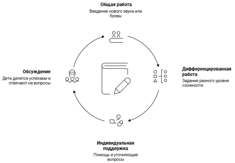 Структура урока чтения при таком подходе выглядит следующим образом. В начале проводится общая работа со всем классом: знакомство с новым звуком или буквой, чтение слов с доски, короткая речевая разминка. На этом этапе дети находятся в равных условиях и работают вместе. Далее следует этап дифференцированной работы. Ученики получают карточки с заданиями разного уровня сложности. Карточки отличаются цветом, но не имеют никаких оценочных обозначений. Дети знают, что цвет карточки может меняться, и переход на другой уровень воспринимается как личный успех. В это время я поочерёдно подхожу к детям, слушаю чтение, задаю уточняющие вопросы, помогаю, но не выполняю за них задания. В конце урока обязательно проводится общее обсуждение: дети делятся тем, что получилось, читают вслух по желанию, отвечают на вопросы по тексту.