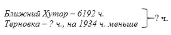 В 2015 году в ПМР проводилась перепись населения. По данным переписи в селе Ближний Хутор проживает 6192 человека, а в селе Терновка проживает на 1934 человека меньше. Сколько жителей в селе Терновка? Сколько человек проживают в этих сёлах?