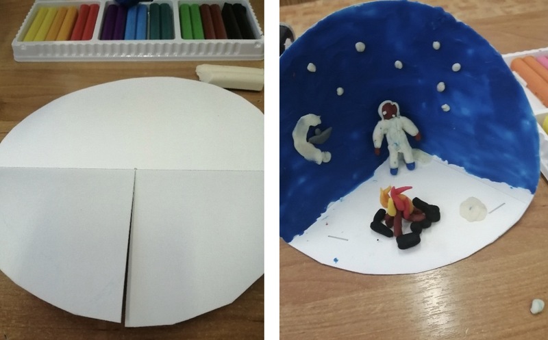 **Что делаем?** Возьми картон, вырежи из него круг, образуй из этого круга небольшую студию для создания кадров. Это будет экран твоего мультфильма. На заднюю стенку наклей рисунок северного сияния (разноцветные полосы). Вырежи из бумаги фигурки детей на коньках, собачью упряжку, можно льдинки. Прикрепи их на ниточки или палочки. Теперь двигай своих героев по «океану» (дно можно раскрасить в синий) и рассказывай историю от их имени. Что они видят? Куда мчатся? Что чувствуют? Так ты становишься не просто читателем, а **соавтором**, который придумывает продолжение.