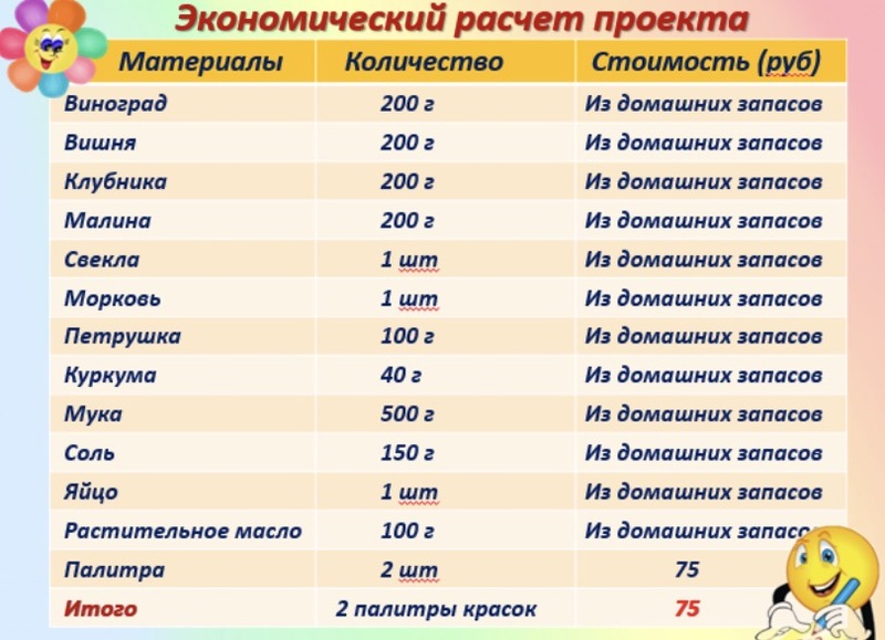 Мы произвели экономический расчет нашего продукта. Потратив 75 рублей, мы получили натуральные краски разных цветов!