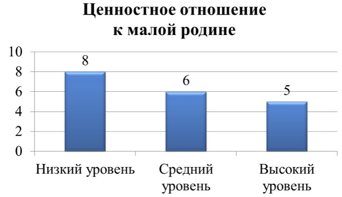 Результаты показали, что из 19 учеников 5 детей обладают высоким уровнем, 6 человек – средним уровнем и 8 школьников обладают низким уровнем ценностного отношения младших школьников к малой родине. Результаты представлены на рисунке 1.