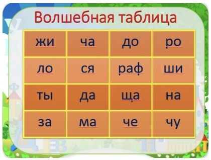 - На экране волшебная таблица, в которой даны слоги. Вам нужно всей командой составить как можно больше слов с нашими знакомыми буквосочетаниями.