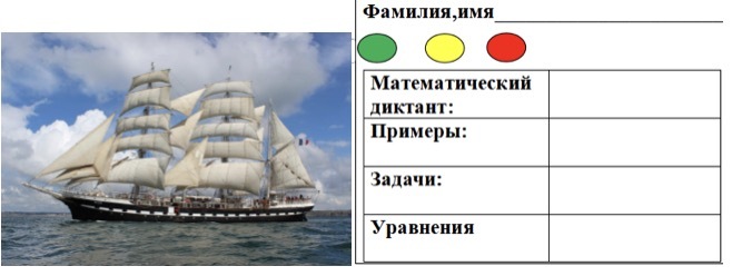 Давайте ребята учиться считать, Делить, прибавлять, умножать, вычитать, Запомните все, что без устного счёта, Не сдвинется с места любая работа. А урок у нас необычный, урок - путешествие. По морям мы с вами поплывём на корабле под названием «Математика» к острову и вспомним, чему научились на уроках. Д На столах у вас лежат листы самоценивания, за работу в течение всего урока каждому нужно себя оценить, а в конце урока мы посмотрим, как вы справлялись с заданиями. -Откройте тетради, запишите число, классная работа.