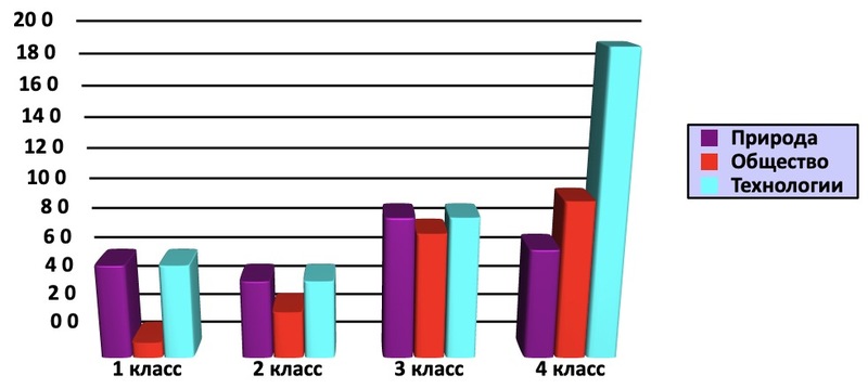 Так же после каждого года обучения на итоговых занятиях проводились опросы по интересам, на которых выбирались самые лучшие проекты за весь год. И вот какие результаты. В 1-ом классе учащихся больше всего интересовали проекты, связанные с природой, человеком и новыми технологиями, менее интересными казались проекты на тему общества. И к 4 классу всё поменялось: из предложенных проектов учащиеся выбрали те, которые связаны с изучением новых технологий современной жизни, а меньше всего проектов связанных с природой.
