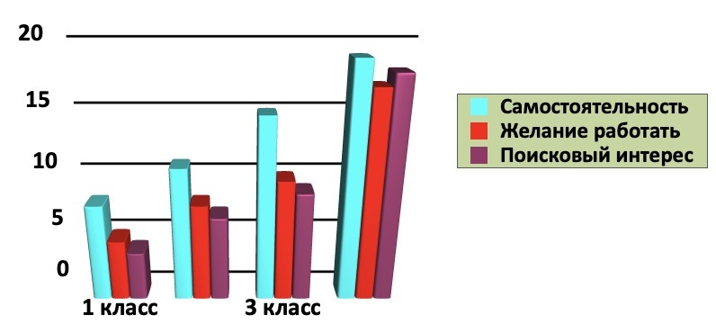 На диаграмме видно, какова динамика показателей : самостоятельности, желания работать и формирование поискового интереса. Так вот: если самостоятельность при работе с проектом проявляли на конец 1 класса- 8 учащихся, во 2-11, в 3-15, то в 4-19 учеников; желанием работать в 1 классе обладало-5 ребят, а к 4 -17; в 1 классе поисковым интересом обладало всего-4 учащихся, то к 4 их стало уже-18.