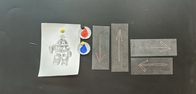 - Магнитные карточки со стрелками (↑, ↓, →, ←) и картинками (робот, дом, огонь, вода).