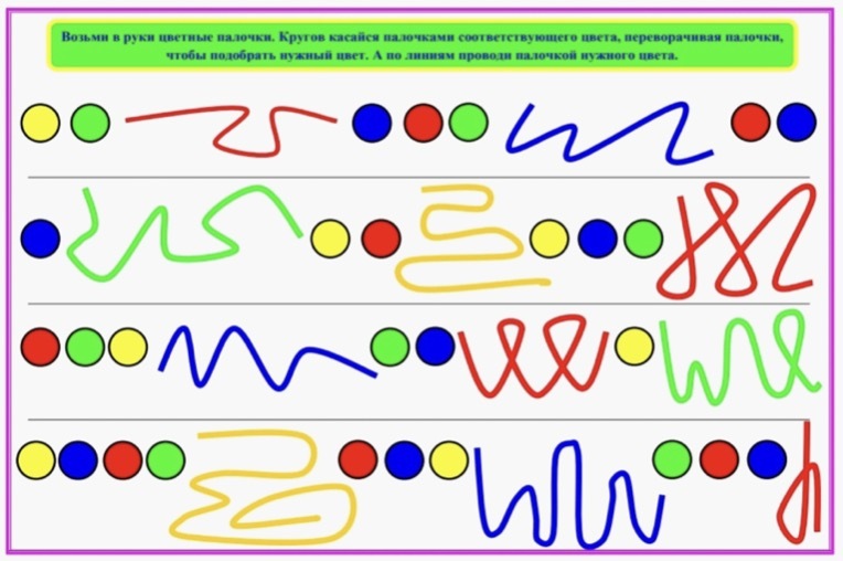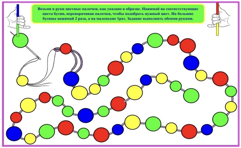Возьми в руки цветные. палочки. Нажимай на соответствующие цвета бусин, переворачивая палочки, чтобы подобрать нужный цвет. На большие бусина нажимай 2 раза, а на маленькие 1 раз. Задание выполняй обеими руками.