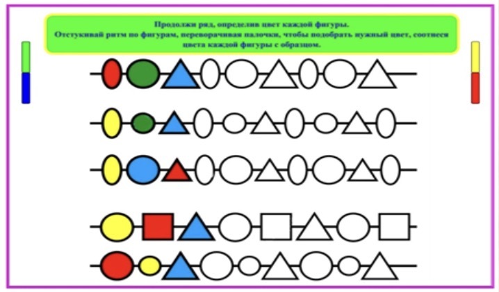 Продолжи ряд, определив цвет каждой фигуры. Отстукивай ритм по фигурам, переворачивая палочки, чтобы подобрать нужный цвет, соотнеся цвета каждой фигуры с образцом.