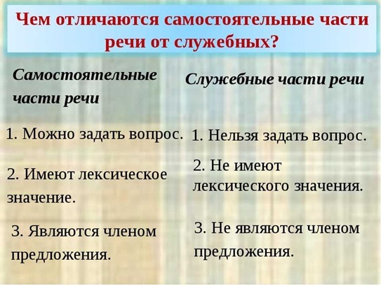 - Вспомнить различия между самостоятельными и служебными частями речи;