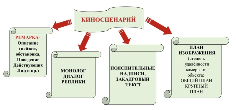 Сценарий в кинематографе, как правило, напоминает пьесу и подробно описывает каждую сцену и диалоги персонажей. Главное в киносценарии: основная мысль и идея. Вспомним элементы киносценария.