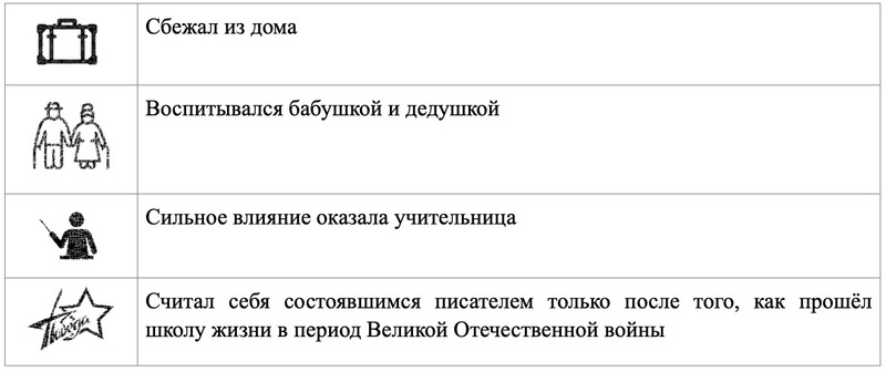 Чемодан – это метафора того, что является важным для писателя, предметы или детали его характеризующие. Знакомясь с биографией творческого лица, из статьи учебника обязательно в символической форме (своего рода эмодзи) зарисовываем некоторые сведения о нём. Например, биографию В. Астафьева разложили с пятым классом следующим образом: