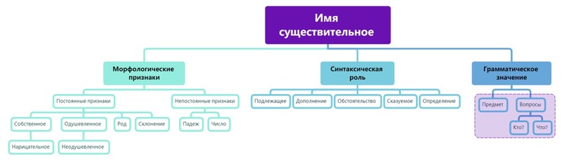 Основные ветки будущей карты я вывожу сама: морфологические признаки, грамматическое значение, синтаксическая роль. Затем обучающиеся заполняют каждый из признаков путем добавления соответствующих ответвлений.