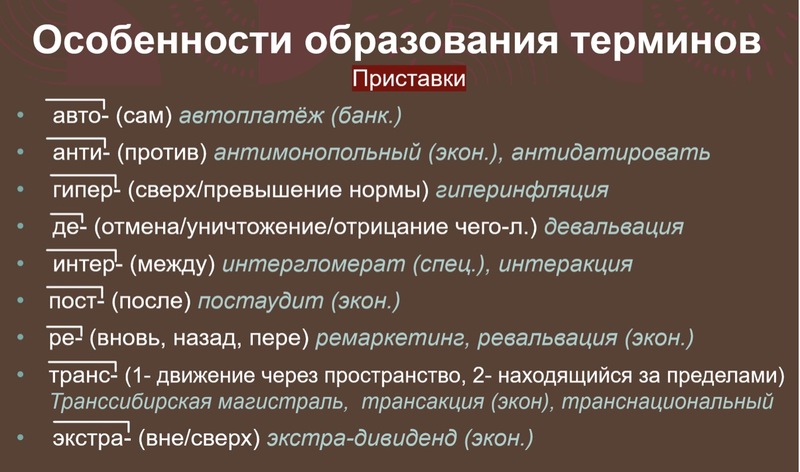 Далее новый материал подаётся блоками. Первый блок посвящён словообразованию профессионализмов. На телеэкран выводятся профессионализмы экономистов (рисунок 5), производится анализ языкового материала и делается вывод о том, какими способами, кроме ранее изученных, могут образовываться профессиональные слова. В презентации используется анимация, поэтому способы образования профессионализмов студенты видят на экране только после коллективного обсуждения и вывода.