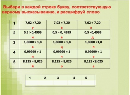 - Продолжаем нашу работу. Перед вами высказывания. Выбери в каждой строке букву, соответствующую верному высказыванию, и расшифруй слово