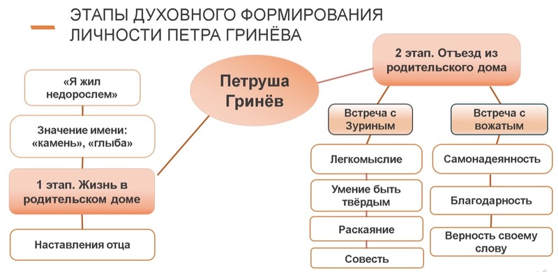 - Как видим, духовное формирование Петра Гринёва, некогда недоросля Петруши, начиналось с 2-ух этапов: жизни в родительском доме на примере родителей, добрых и честных людей, с напутствия отца: