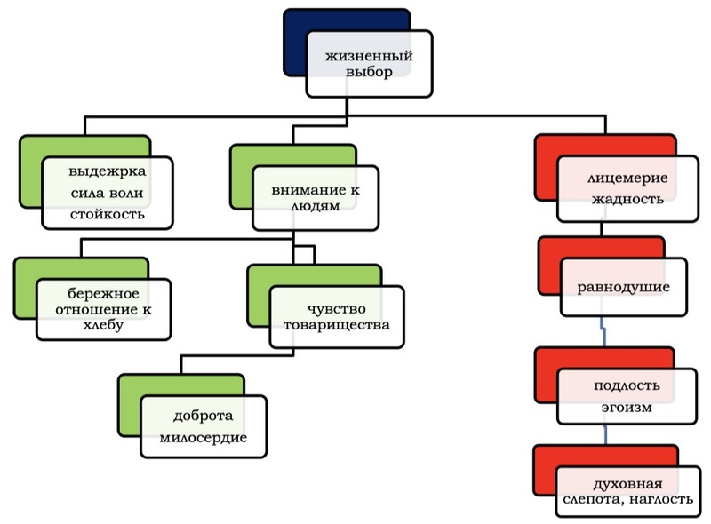 Учитель: На отношении к людям, к хлебу, в сложнейших условиях войны раскрываются прямо противоположные линии поведения, взаимоисключающие жизненные позиции, и такой художественный прием, как антитеза, здесь просто незаменим.