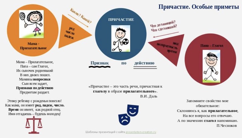 Причастия: * Читавший * Читающий * Построенный Время: * Настоящее время * Прошедшее время