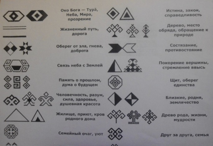 Основные элементы узора выполнялись черным цветом — цветом добра, цветом земли. Узоры заполнялись преимущественно красным цветом — цветом счастья, зеленым — цветом природы и жизни, желтым — цветом солнца, синим — цветом волшебства. Все эти цвета прекрасно сочетались на белом фоне — белый цвет — символ чистоты, правдивости и мудрости. Для красочности и выразительности изделий применялись различные украшения: тесьма, кружева, монеты, бисер, раковины.