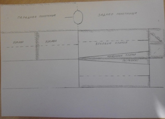 - А теперь познакомимся с названиями частей кепе, которые нам предстоит вырезать: переднее и заднее полотнища (кěпе пÿлěхě), боковые клинья (кěпе хăййи), вырез для шеи - ворот (çуха), рукава (санă), ластовица (кěштěк, хултă)-клин, вшиваемый в пройму и рукав под мышкой.