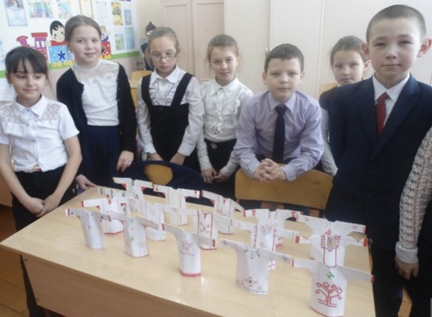 А сейчас, нам, ребята, осталось украсить платье чувашскими узорами, Это мы сделаем на следующем уроке.