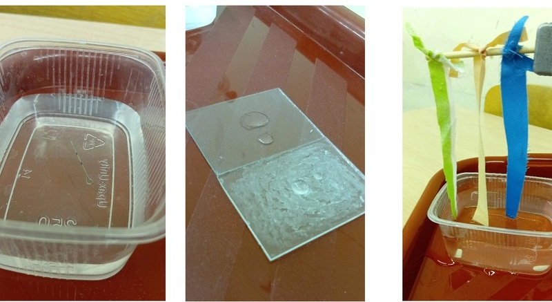 Поместить лоскутки материи (хлопчатобумажная, синтетическая, курточная) в емкость с водой на глубину не более 1 см. Описать в тетради, что происходит с полосками ткани. Сравнить уровень поднятия воды и скорость распространения воды по различным видам материи. Объяснить полученные результаты. |