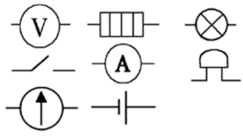 - У вас на столах оборудование (батарейка, лампочка на подставке, ключ, комплект проводов, амперметр), составим схему возможной электрической цепи. ( работа в группе)
