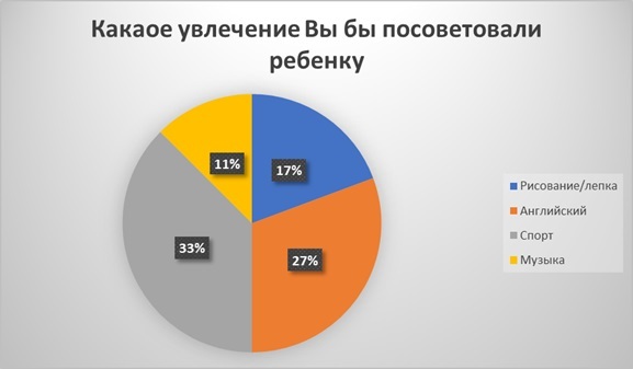Другие 2 родителей (11%) предпочли, чтобы их дети занимались музыкой. Как видим, лидеры среди увлечений с точки зрения родителей – малоподвижные занятия для детей.