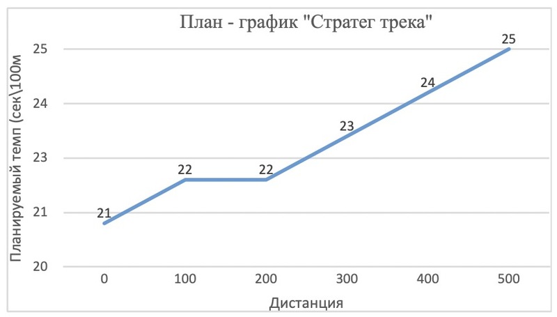 - На примере видно, что ученик планирует начать забег в темпе ~21 сек на 100 м и постепенно замедляться к финишу до 25 сек на 100 м.