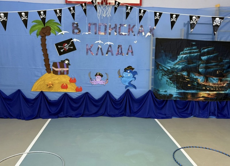Оборудование: туннель, обручи, кегли, стоики, канат, сундук пирата с призами; воздушные шары, флажки, плакаты; реквизиты для каждого испытания.
