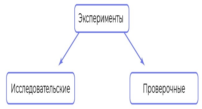 В зависимости от того, какие задачи решаются в ходе эксперимента, последние подразделяются на исследовательские и проверочные.