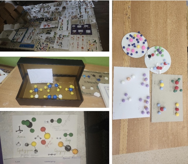 Учитель Предлагает домашнее творческое задание сделать из пластилина поделку химические модели веществ.