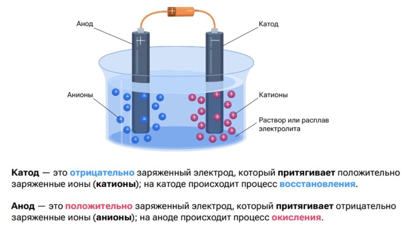 - Катод (−) — притягивает катионы, происходит восстановление.