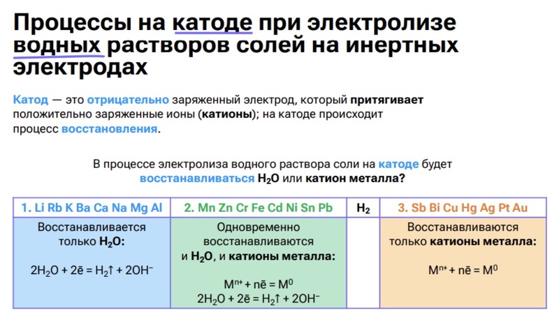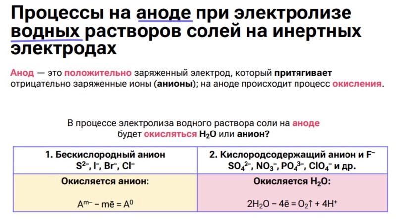 - На аноде: если анион бескислородный — выделяется неметалл; если кислородосодержащий — выделяется O2.