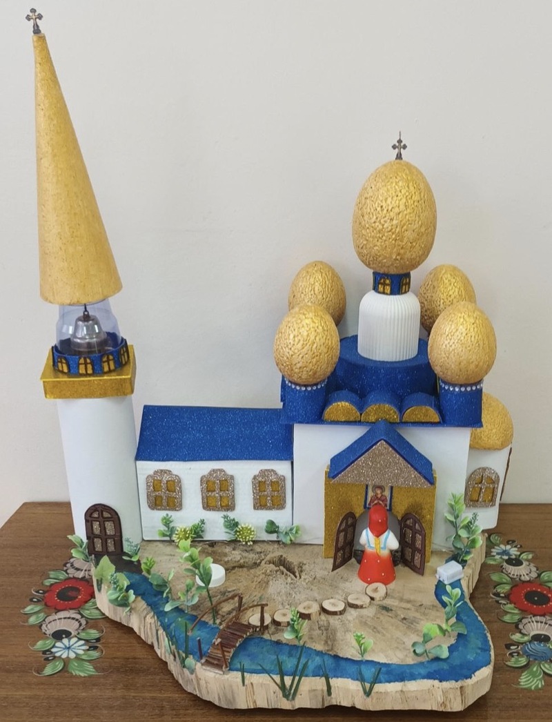 Описание макета. На макете представлен Свято-Троицкий Островоезерский монастырь, расположенный в г.Ворсма, Павловского района, Нижегородской области. Выполнен макет из коробок, картона, пенопласта; имеет подсветку. Основой для макета служит сухой деревянный спил. Монастырь расположен на острове, что также отражено в его оформлении. Также при украшении макета использованы православные символы - крестики, иконка, колокол и характерные для православного храма цвета – белый, золотой, синий. Макет отражает особенности архитектуры православного храма (купола, портал, звонница, барабан, аспида и др.). Фигурка женщины – демонстрирует женскую одежду на Руси (сарафан, рубаха, передник, платок).