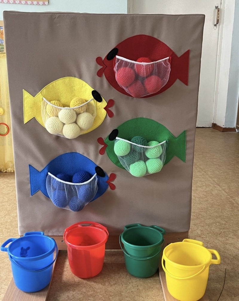 Формирование представлений о цвете мы осуществляли в процессе игр с ширмой «Рыбки». Знакомство с такой характеристикой предметов, как цвет начали с сюрпризного момента - обратили внимание детей на предметы определённого цвета, лежащие в кармашке у рыбки («Посмотрите, что принесла рыбка), предлагали достать предмет, отмечали, что предмет такого же цвета, как и рыбка.