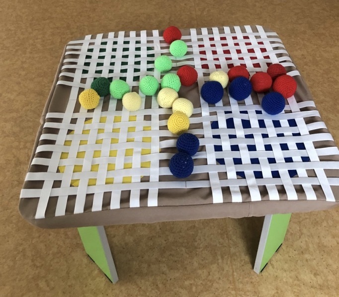 На полотне под резинками были пришиты цветные сектора, что позволяло организовывать игры по соотнесению предметов по цвету.