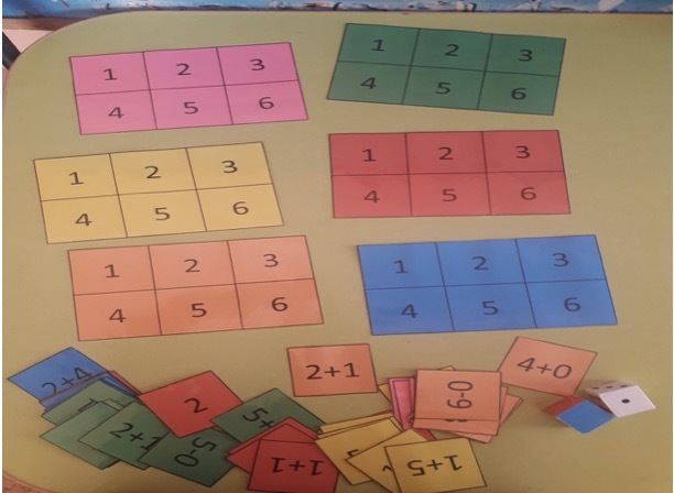 3 вариант. Ребенок должен найти карточку с примером (в котором результатом будет количество точек на кубике) и взять карточку себе.