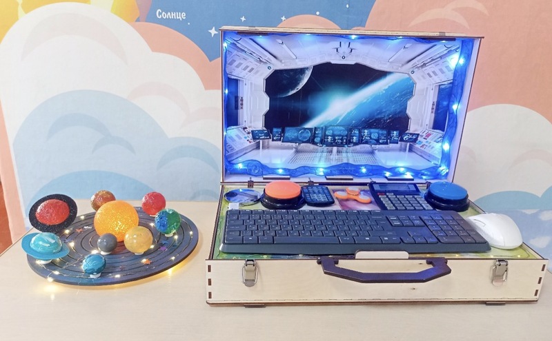 Центр управления полётами представляет собой чемодан из фанеры внутри которого находится бизиборд – развивающая доска со всевозможными звуковыми кнопками, клавиатурой, компьютерной мышкой и другими интересными для детей предметами. Яркие и красочные визуальные эффекты, а также захватывающие звуковые кнопки с голосом Юрия Гагарина, со звуком взлетающей ракеты создают впечатляющую атмосферу космического приключения. Внутри на крышке чемодана картина с видом во вселенную из кабины космического корабля.