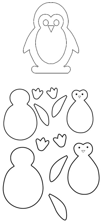 -Затем на белой бумаге обводим по шаблону грудку. -Сейчас берем оранжевую бумагу и обводим по шаблону лапки. -И сейчас берем красную бумагу и обводим по шаблону клюв пингвина. -После того, как вы все обведете, вырезаете то, что вы обвели по шаблонам. -Затем приклеиваем на туловище, белую грудку, затем клюв, посередине туловища, на уровне, где начинаются крылышки у пингвина. -Сейчас, мы с вами должны приклеить лапки, нам надо наклеить чуть – чуть внахлест на туловище. -Ну а затем, мы с вами можем нарисовать пингвину глазки фломастером или карандашом. -А в самом конце мы с вами расположим пингвина на большом листе, льдине, там у нас будет очень много друзей Ластика, по которым он очень соскучился. Я приклею на льдину первого его друга.