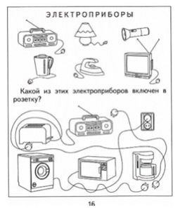 -Нужно провести пальчиком по лабиринту и найти путь от каждого героя к тому электроприбору, которым он пользуется. Потом закрасьте этот путь цветным карандашом. Дети выполняют задание. Воспитатель помогает при необходимости -Молодцы! Обменяйтесь карточками с соседом по парте и проверьте друг у друга. Расскажите друг другу, какой герой каким прибором пользуется, и почему. И самое главное – дайте друг другу советы по безопасному использованию этих электроприборов. -А теперь давайте проверим, правильно ли вы выполнили задание. (Дети по очереди рассказывают, какой герой каким электроприбором пользуется и почему, затем дают советы героям по безопасному использованию электроприборов.) |